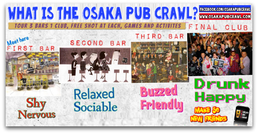 The Osaka Pub Crawl is basically a "bar tour" or "bar-hopping." We will organize a group of people; some friends, some complete strangers, and visit various bars and/or clubs over the course of an evening in Osaka. In a nutshell, the Osaka Pub Crawl is a great way to experience some fun venues that the city's nightlife has to offer, and meet people along the way. Annnnnd its pretty cheap. Annnnnd you'll get pretty drunk, if that's your thing.