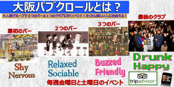大阪パブクロールは、大阪のナイトライフを満喫しながら、たくさんの人、世界各国からの旅行者などに出会える最高の機会です!